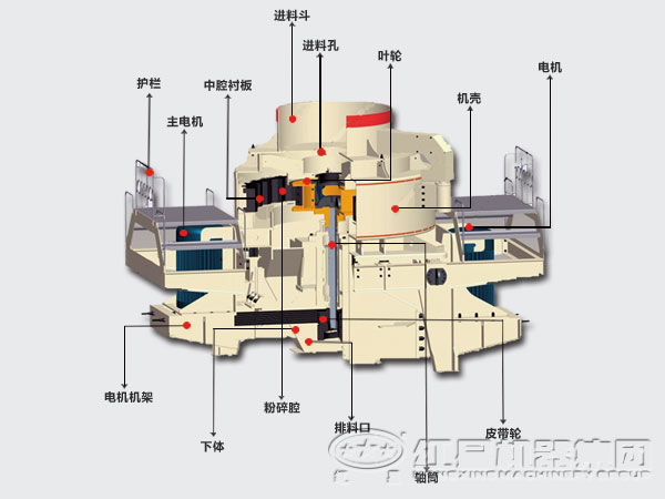 制砂機一般結構:制砂機主要由進料口、溢料裝置、轉子、破碎腔、驅動裝置及機座這幾大部分組成。其工作原理是:物料由進料口進入破碎機,在破碎機頂部由溢料裝置將物料分為兩部分,一部分經(jīng)溢料口進入破碎腔,另一部分直接進入轉子,物料以50-80m/s的速度從轉子內(nèi)三個均布的流道口發(fā)射出去,與溢料流發(fā)生碰撞,然后一起沖向破碎腔內(nèi)的物料墊,被物料墊反彈,斜向上沖擊到破碎腔的頂部,又改變其運動方向,偏向下運動,與溢流石料重新組合,這樣每塊物料在破碎腔內(nèi)受到兩次甚至多次破碎作用,而后從破碎腔落下由排料口排出。在整個破碎過程中實現(xiàn)的是物料與物料的碰撞,有效地減少了磨損。