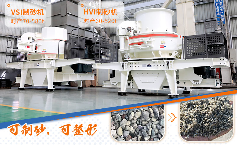 制砂機,兼具整形效果,將中細碎后的砂石料進行制砂整形,成品料粒度在0-5mm,粒形好,品質(zhì)高,設(shè)備自動化程度高,安全可靠,耐用易保養(yǎng),節(jié)能環(huán)保,有三個HX、VSI和HVI三個系列,推薦型號HVI 0922(時產(chǎn)70-210噸)、VSI 8518(時產(chǎn)140-260噸)。